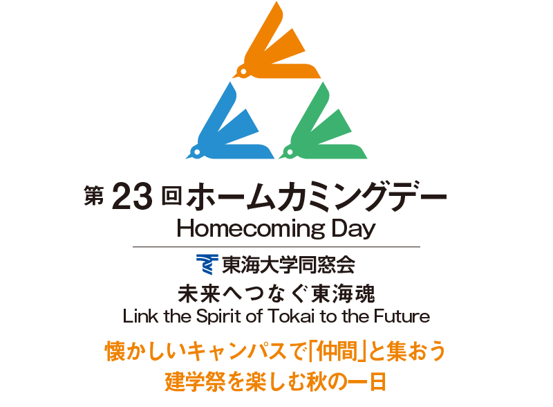 「第23回ホームカミングデー」 開催日:2025年11月3日(月・祝) 会 場:東海大学湘南キャンパス総合体育館/総合体育館前広場 コムスクエア1階/6号館C棟 時 間:10:00~17:00 懇親会:15:30~17:00(総合体育館への入場は14:30~) <先着1,000名様にオリジナルグッズ、建学祭で使える金券、プログラムをプレゼント> <来場者全員に海外旅行などが当たる抽選券を配布します> ※オンライン抽選会への応募はこちらから