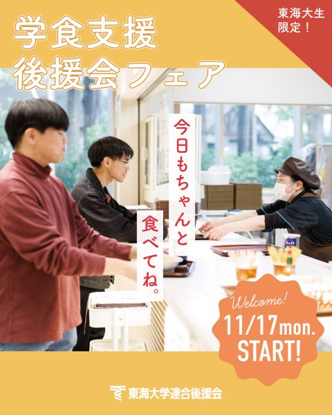 本学の全7キャンパスにある学生食堂で11月17日(月)から、東海大学連合後援会の支援によって学生を対象に特定メニューの割引や限定メニューなどを提供する「後援会フェア」を秋学期も実施!