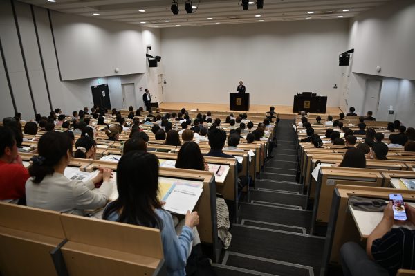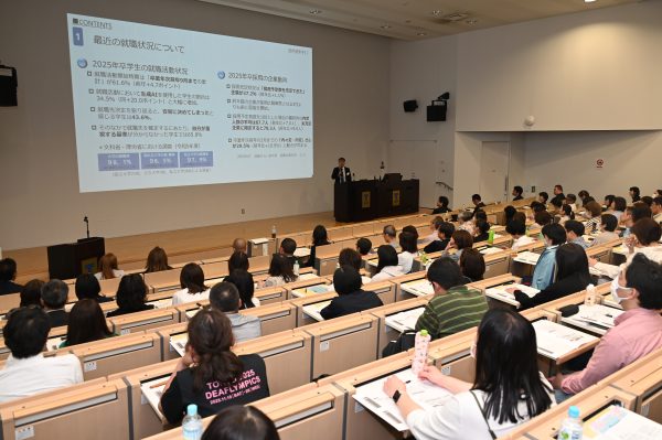 木村学長は、札幌から熊本まで7つのキャンパス、23学部を持つ国内最大の総合大学でありながらきめ細かな学生サポートを実践している様子や、充実した教育・研究環境などを紹介しました。続いてヒューマンソサエティカレッジオフィスやウェルビーイングカレッジオフィス、学長室の職員から大学生活や単位修得、キャリア支援の現状などについて詳しく説明しました。